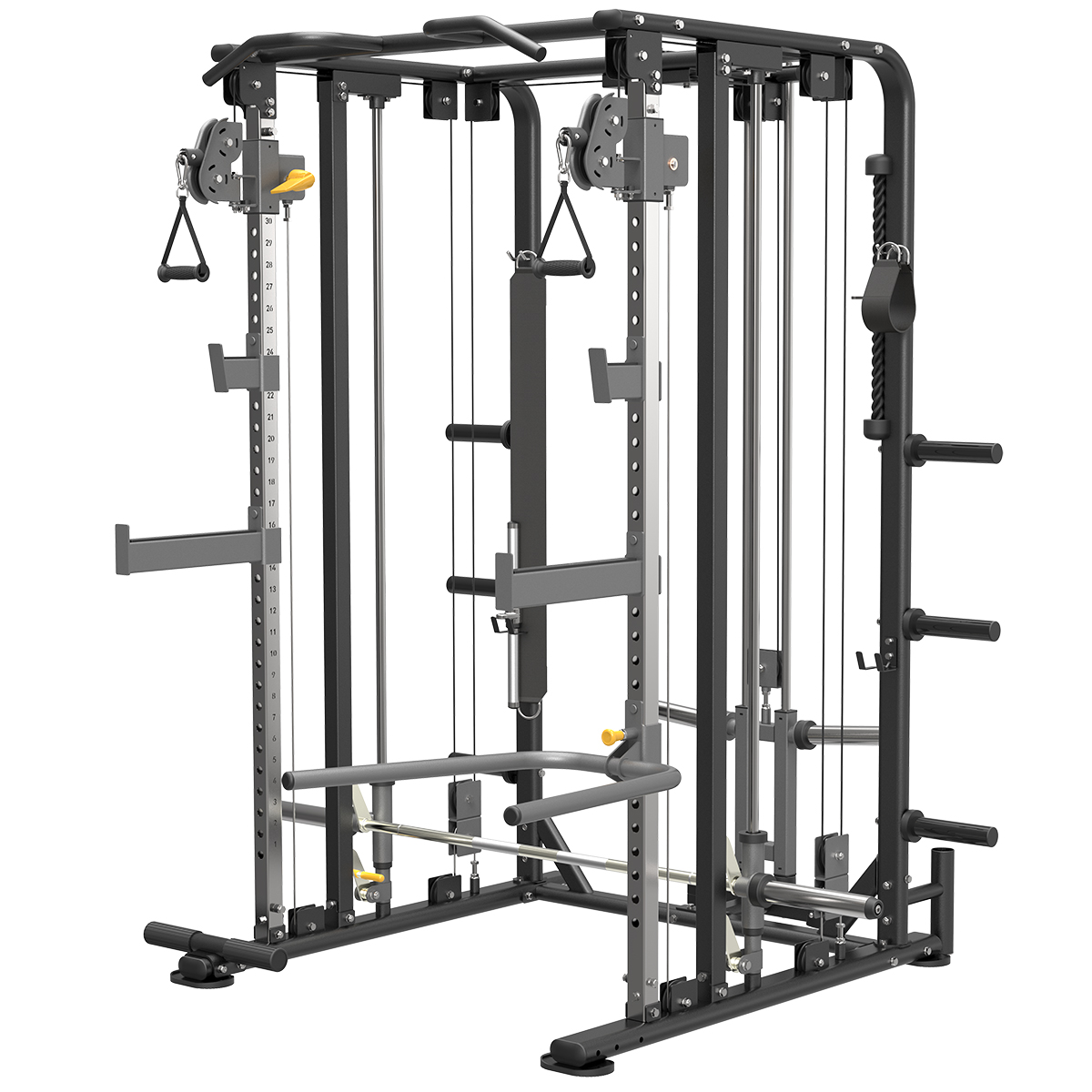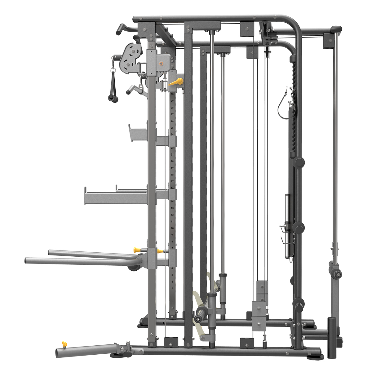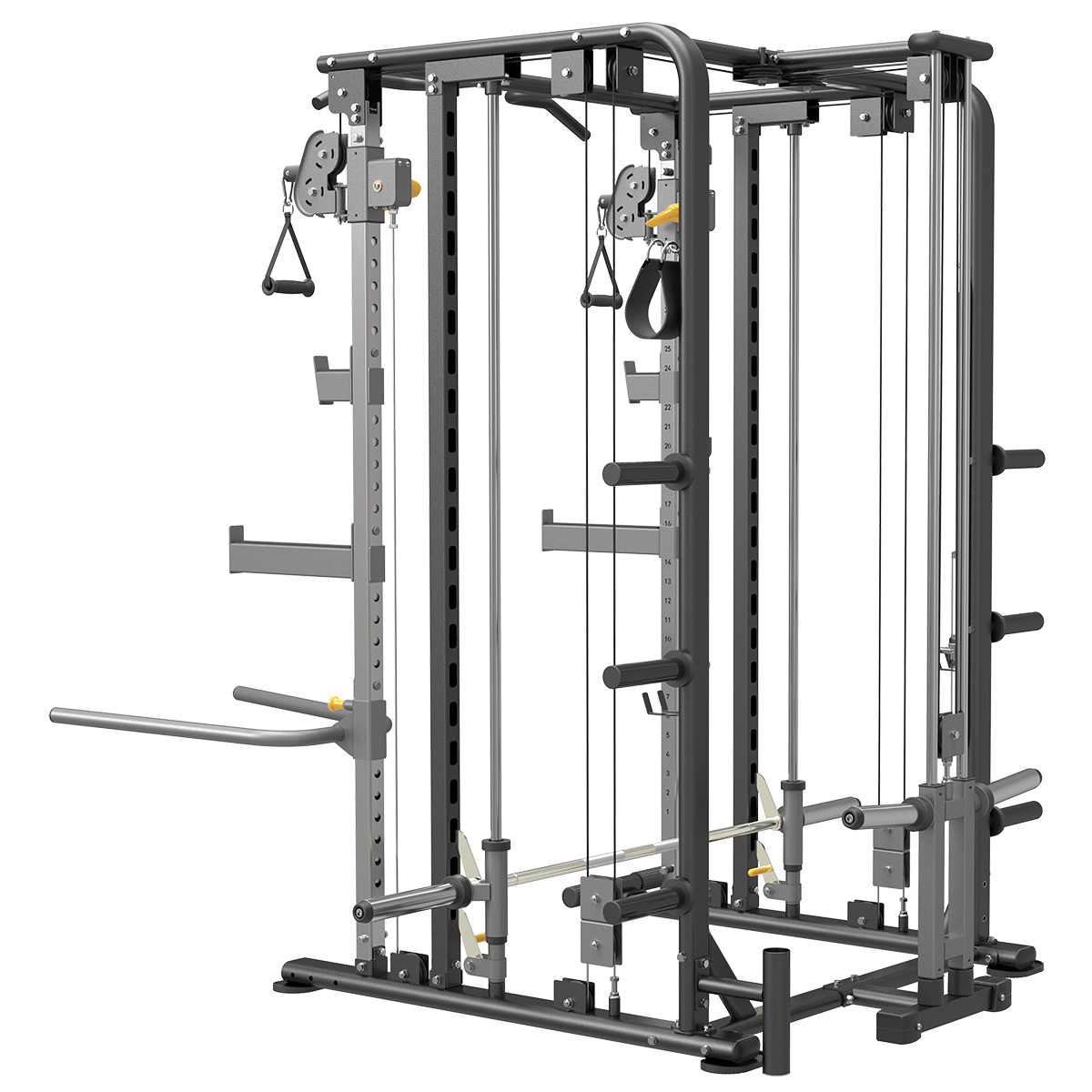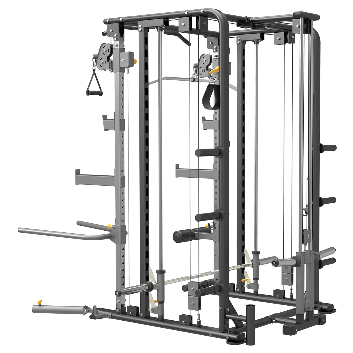 ● Barre de tractions intégrée ● Points de tirage en hauteur sur 33 niveaux ● Barre guidée avec crochets de sécurité réglables en hauteur ● 6 épis range-disques intégrés ● 2 crochets de sécurité J-Cup ● 2 crochets de sécurité étendus ● Accessoires fournis : deux poignées simples, une corde à triceps, une barre biceps/triceps, une sangle d'aide aux tractions, une barre de dips, une chevillière, un range barre olympique vertical ● Accessoires optionnels : pivot "Landmine", kit lat pulldown (barre de lat + rondins de calage) ● Charge maximale : 200 kg